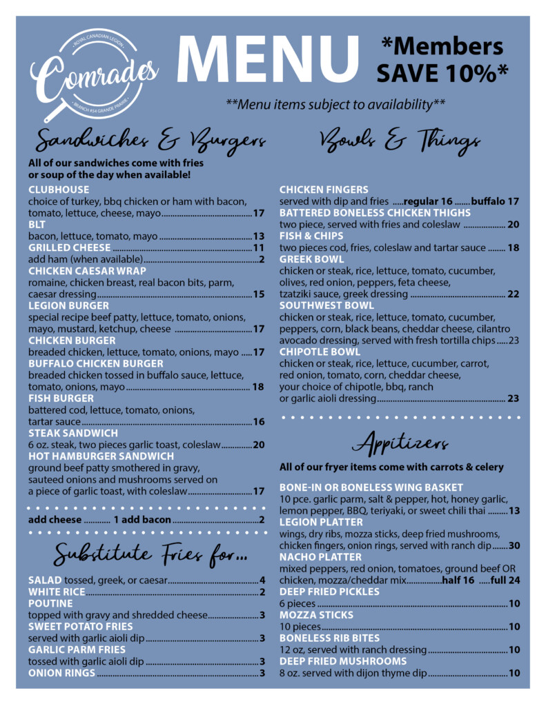 You can find our cook, Rob serving his amazing daily soups, some of the best ribs in town, his version of the Legion Burger, and so much more that everyone has come to love!